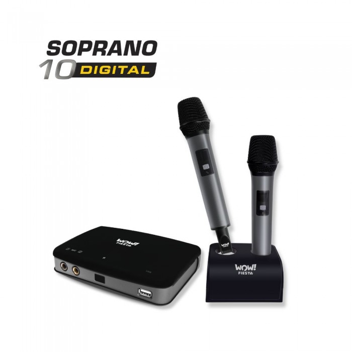 WOW Fiesta Soprano 10 Digital box contains the main unit, two (2) digital wireless microphones with stand, song list, remote control, HDMI and RCA cables, AAA batteries, power adapter, free USB and a carrying bag.